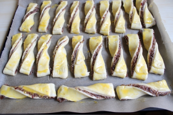 То же самое проделавыем с друхой частью теста. Выкладываем наши вертуны на лист. Смазваем желтком. И ставим в духовку на 15минут при 200гр. Духовка должна быть разогретой.