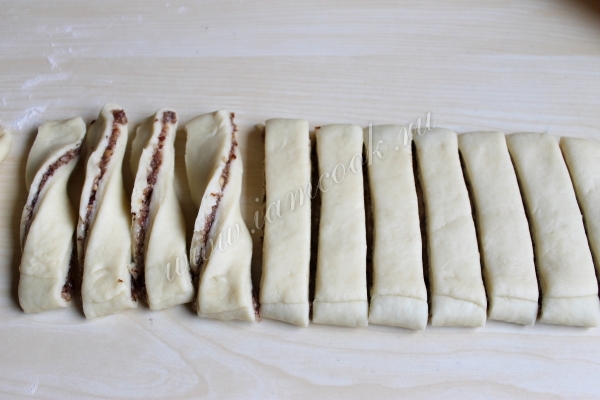 Прокатываем слегка скалкой тесто. И разрезаем его на полоски шириной 2см. И перекручиваем каждую. Вот таким образом.