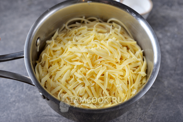 Спагетти отварите согласно инструкции в чуть подсоленной воде, слейте воду, всыпьте часть сыра, перемешайте тщательно.