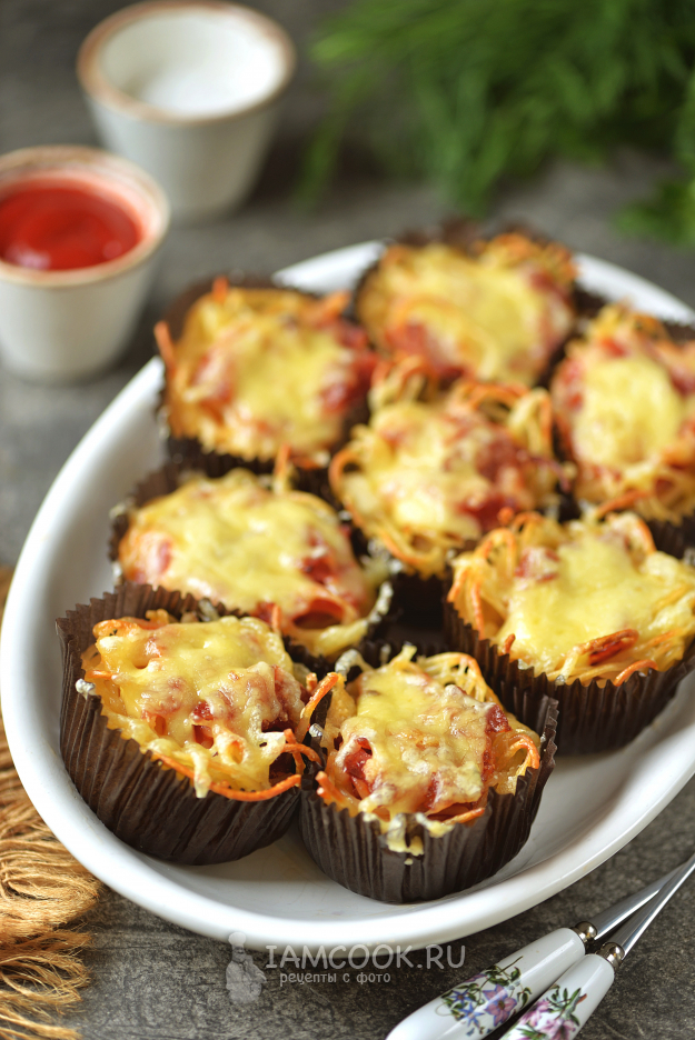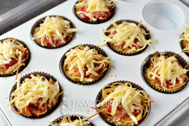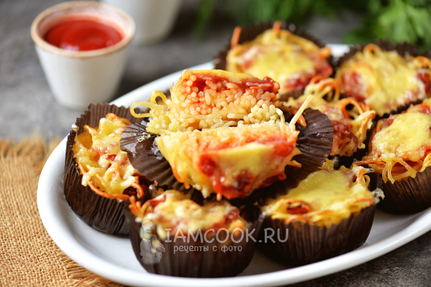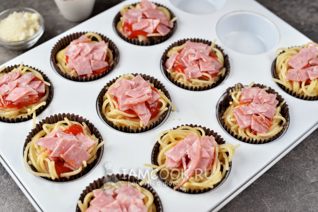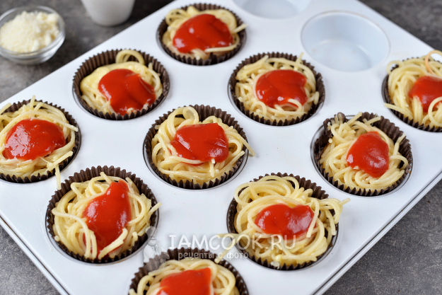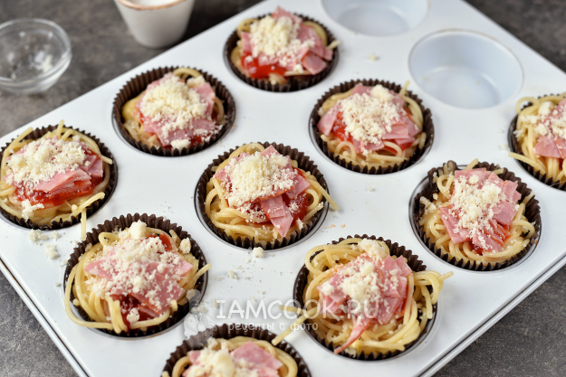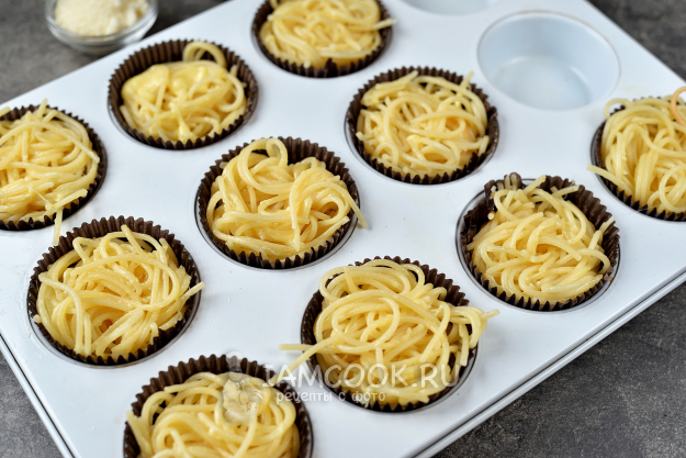 Форму для маффинов выстелите манжетками, разложите спагетти одинаковыми порциями. Или можно просто смазать форму растительным маслом, если вы уверены, что сможете без труда извлечь готовую закуску.