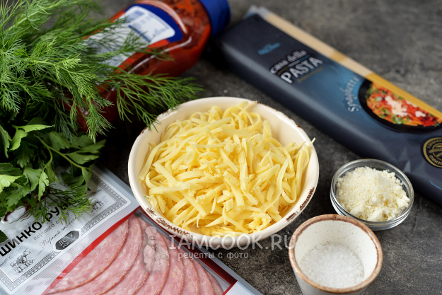 Возьмите продукты для приготовления маффинов из спагетти с ветчиной в духовке. Твердый сыр натрите на крупной терке.