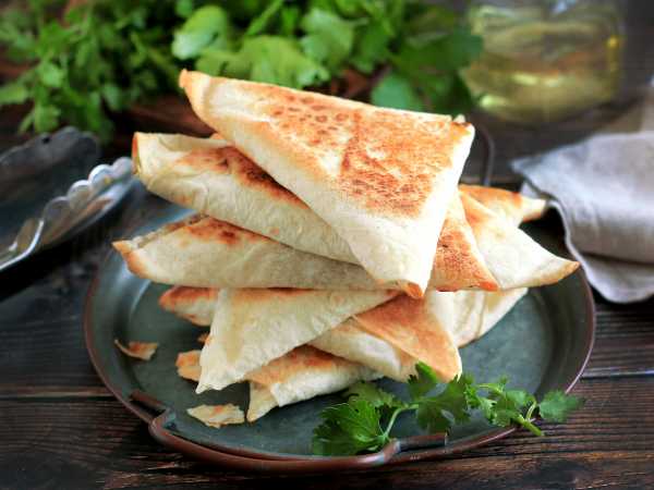Каждую лепешку раскатайте так, чтобы серединка оставалась толще, а края были тонкими. Разрежьте лепешку пополам на две части. Каждую половинку сверните корнетиком, тщательно стыкуя и прижимая края между собой.