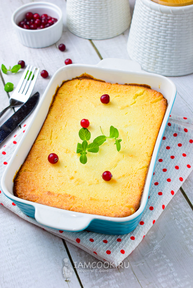 Вегетарианская творожная запеканка готова! Можно дополнить запеканку свежими ягодами.