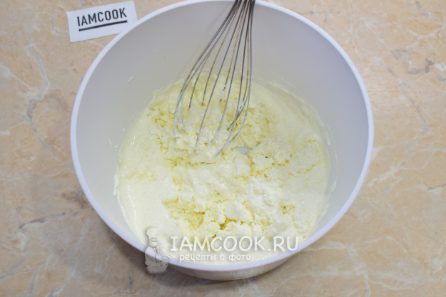 Затем добавьте творог. Разомните его и вмешайте в сметану.