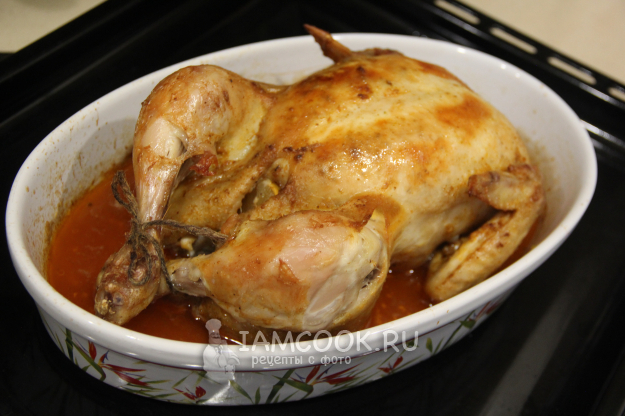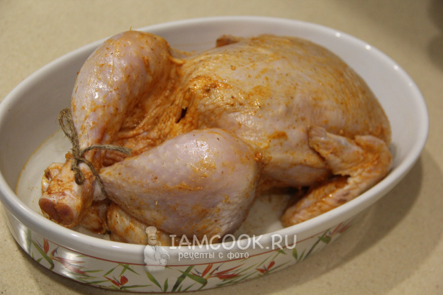 Переложить курочку в форму для запекания. Я связала ножки бечевкой, можно этого не делать. Влить на дно формы воду.