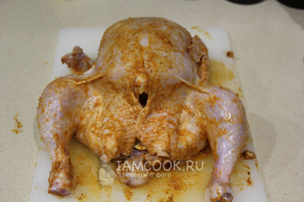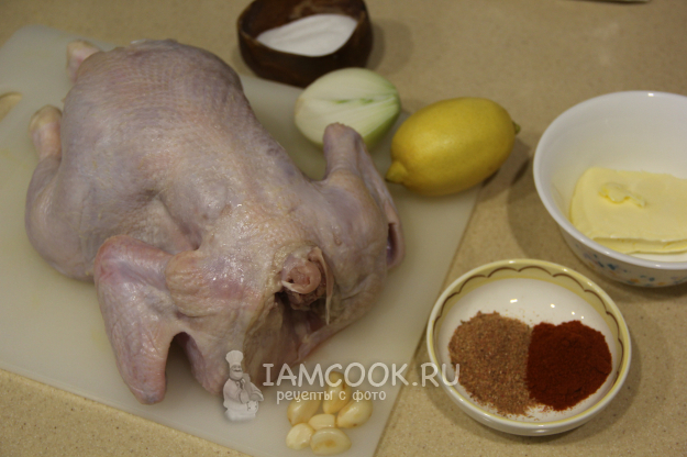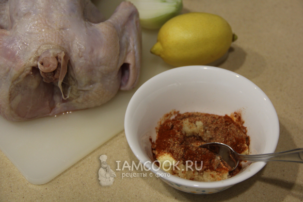 Тушку хорошо натереть солью снаружи и внутри. Масло размягчить при комнатной температуре. Чеснок пропустить через пресс. Соединить чеснок, паприку, масло и специи. Перемешать.