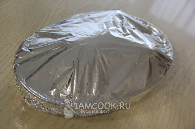 Накрыть форму с курицей фольгой и отправить в разогретую духовку. Запекать 1 час при 200 градусах. Затем снять фольгу и запекать ещё минут 25 до золотистого цвета.