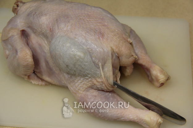 С помощью столовой ложки аккуратно отслоить кожицу от мяса в области грудки и бедер. Кожица не порвется, главное - двигать ложку не резко. В полости под кожей выложить пряное масло.