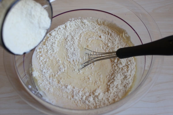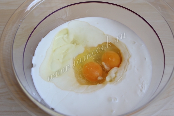 Наливам в чашку кефир и добавляем яйца, одно за другим. Затем вводим соду, соль, масло. Все премешиваем.