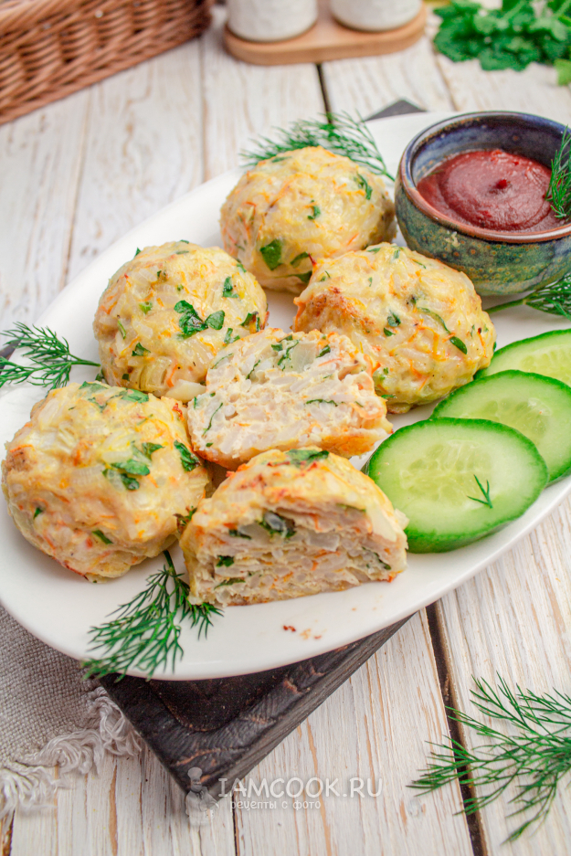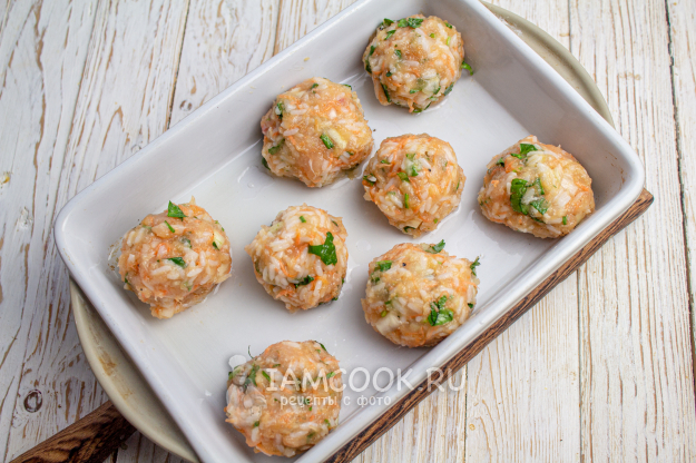 Сформируйте небольшие шарики. Форму для выпечки смажьте растительным маслом и выложите заготовки. Запекайте куриные котлеты с рисом в заранее разогретой до 190-200 градусов духовке 25-30 минут.