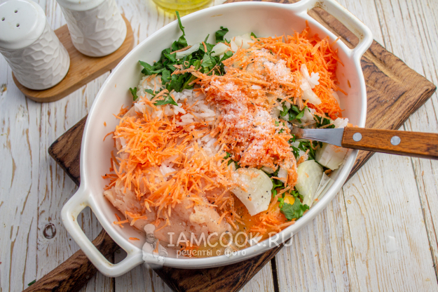 Лук и морковь очистите. Лук нарежьте мелким кубиком, морковь натрите на мелкой терке. Чеснок пропустите через пресс. Зелень измельчите. Добавьте все подготовленные ингредиенты в фарш, посолите и поперчите по вкусу. Хорошо перемешайте.