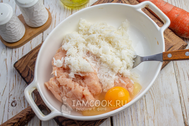 Возьмите все необходимые ингредиенты для приготовления куриных котлет с рисом в духовке.