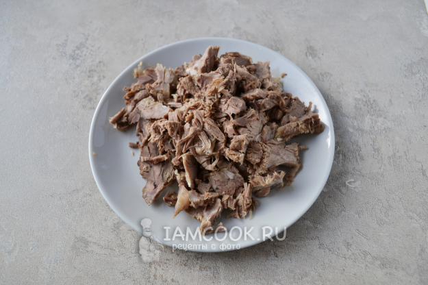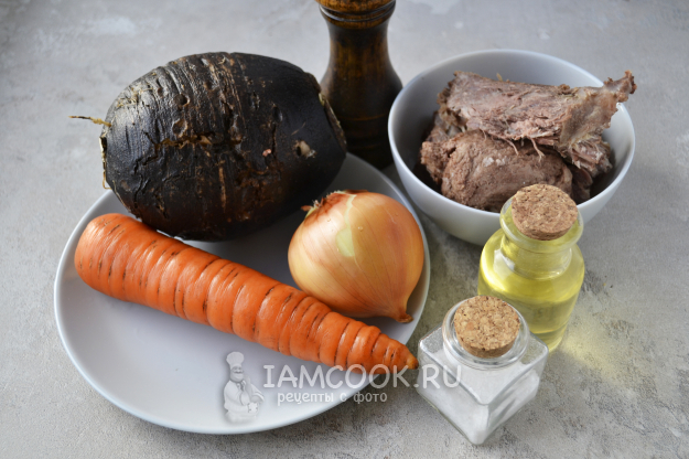 Возьмите продукты для приготовления классического "Архиерейского" салата с редькой и говядиной. Нежирную говядину заранее отварите и охладите.