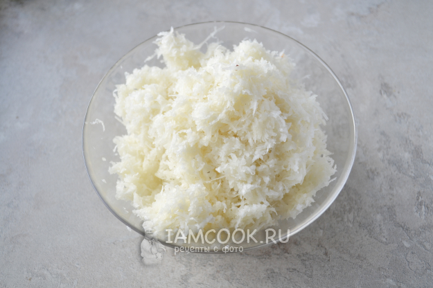 Черную редьку тщательно вымойте, очистите от кожуры и натрите на мелкой терке, отставьте на 10 минут в сторону. Если редька не очень сочная, то можете чуть-чуть ее посолить, так она лучше даст сок.