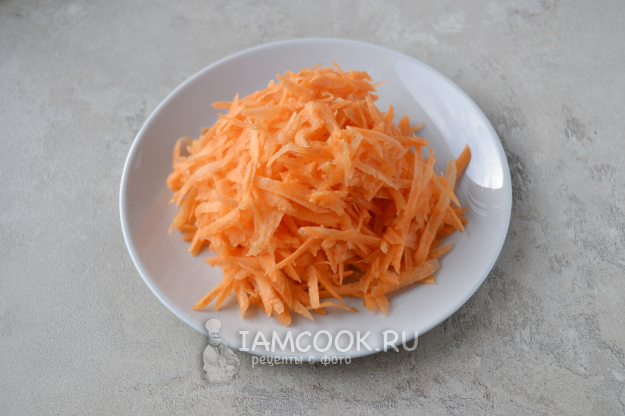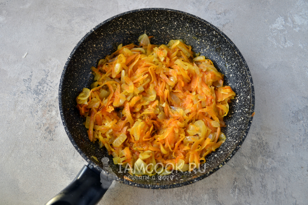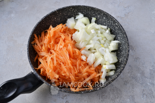 Разогрейте растительное масло в сковороде и отправьте в неё нарезанный лук и натертую морковь.