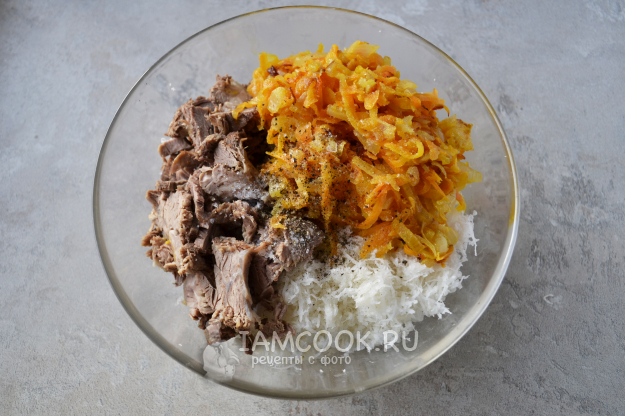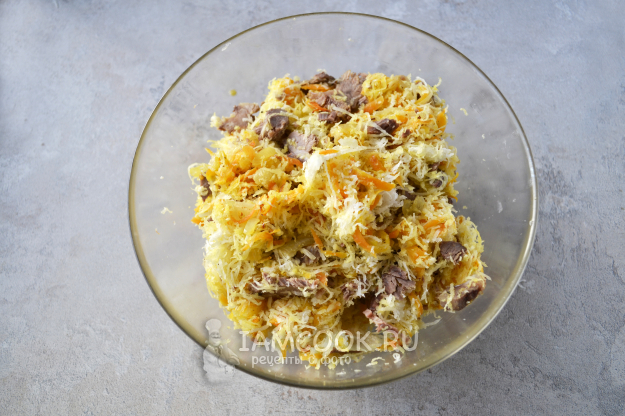 Редьку в салатнике распушите руками, добавьте говядину и обжаренную морковь с луком. Посолите и посыпьте черным молотым перцем.