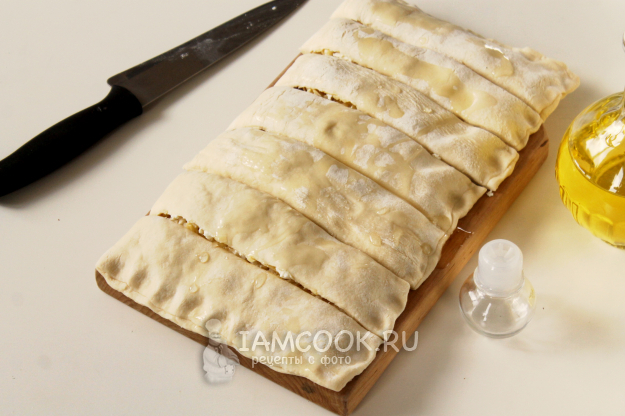 Защипните край прямоугольника, прижимая тесто пальцами. Затем острым ножом разрежьте большую заготовку параллельными полосами шириной порядка 3 см. Слегка сбрызните постным маслом. Выпекайте слойки в огнеупорной форме или на противне в раскаленной духовке при 180 градусах 25-30 минут. Перед выпеканием слойки-полосы можно раздвинуть, также можно уложить тесно и потом разрывать по слипшимся сырным стыкам.