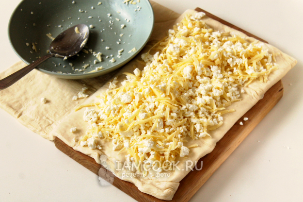 Накройте начинку из творога с сыром свободной половиной слоеного теста.