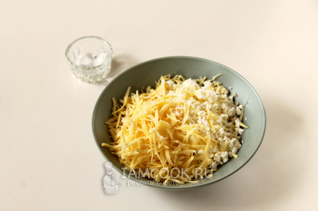 Сделайте начинку: смешайте творог с натертым стружкой сыром, солью по вкусу. Сыр и творог идут в равных пропорциях, но запросто варьировать самостоятельно, ориентируясь на наличие продуктов.