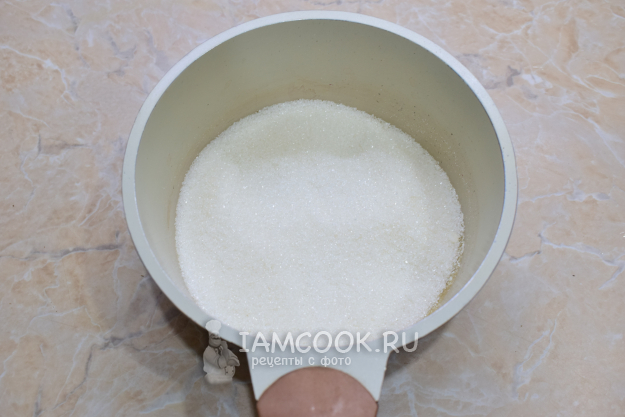 Первым делом приготовим соленую карамель. Насыпьте сахар в ковш или кастрюлю с толстым дном и поставьте на самый минимальный огонь.
