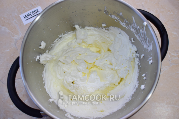Для приготовления крема соедините жирные сливки с сахарной пудрой и взбейте в пышный, стабильный крем. Затем добавьте творожный сыр комнатной температуры и вмешайте его в крем.