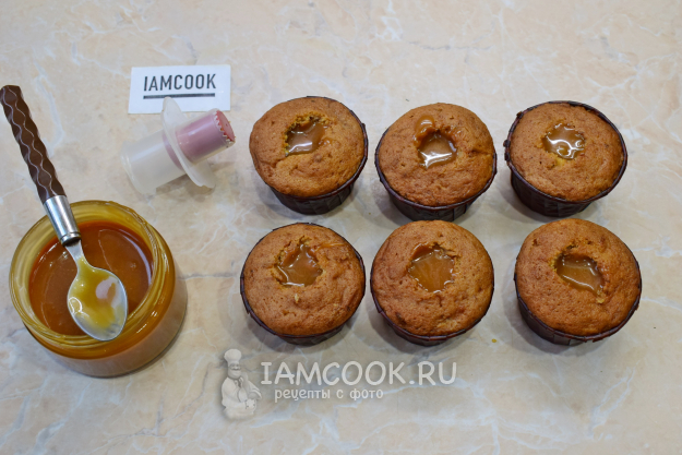 Из остывших кексов удалите сердцевину и наполните их соленой карамелью. Если карамель сильно застыла, то её можно погреть в микроволновой печи.