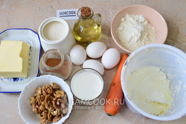 Подготовьте все необходимые ингредиенты для приготовления морковных капкейков с соленой карамелью внутри (и сливочной шапочкой сверху). Муку просейте через сито, чтобы насытить кислородом. Морковь очистите и натрите на терке. Орехи порубите ножом.