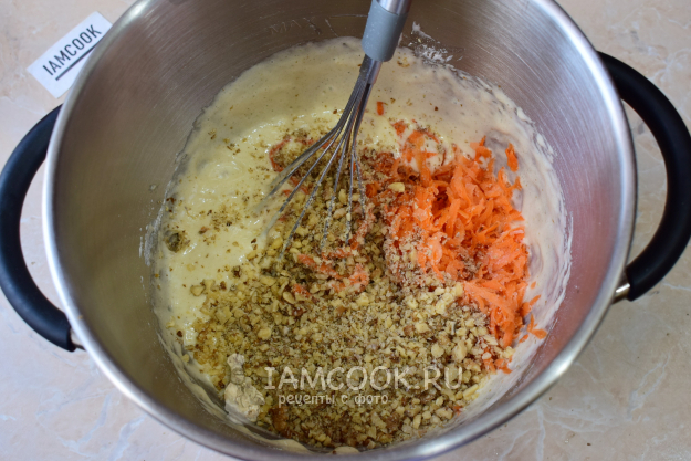 Затем добавьте в чашу измельченные орехи и тертую морковь. Вмешайте их в тесто.