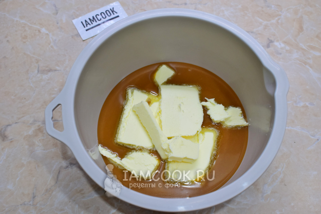В горячую карамель добавьте щепотку морской соли и сливочное масло. Сразу все перемешивайте, чтобы масло растаяло. Полностью вмешайте его в карамель. Если хотите, чтобы готовая карамель сильно не застывала - добавьте меньше масла.
