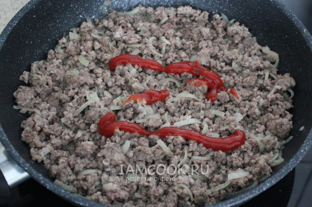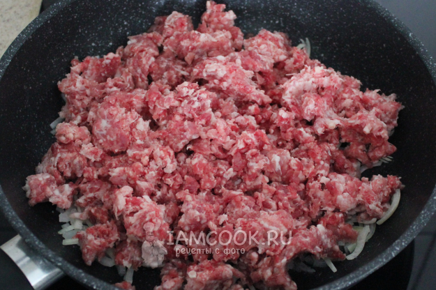 Затем добавьте мясной фарш и жарьте его также при периодическом перемешивании до готовности. Специи и травы – по вкусу.