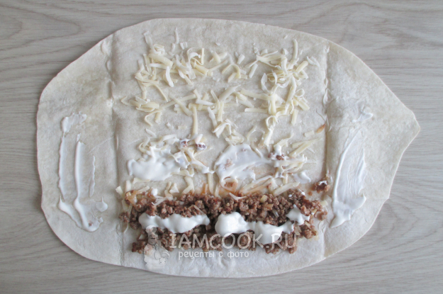 С одного края уложите порцию жареного фарша. На фарш добавьте соус сметано-горчичный, ещё соусом можно слегка смазать и лаваш.