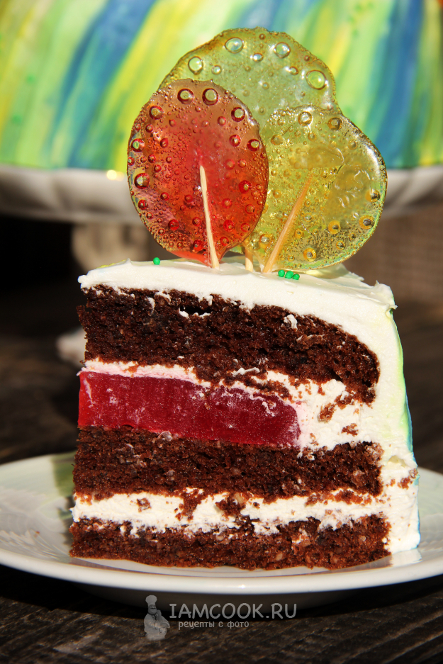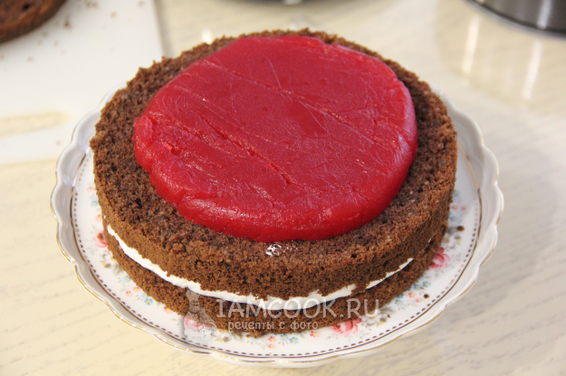 Собрать торт. Первый корж смазать кремом и выложить второй корж. Затем освободить ягодное желе от пленки и выложить на середину коржа.