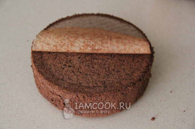 Готовый бисквит слегка остудить, затем снять бортики формы и удалить пергамент. Бисквит поднялся очень ровно. Завернуть бисквит в пищевую пленку и убрать в холодильник на ночь.