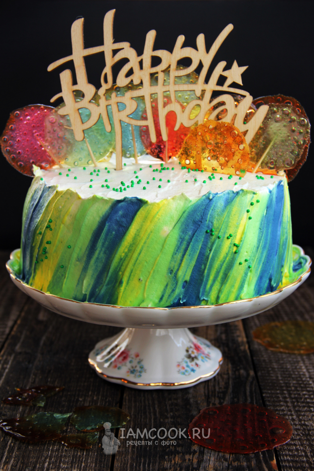 Вставить топер и украсить леденцами или меренгой. Можно просто посыпать цветной посыпкой. Посмотрите, какой яркий и красивый торт с кремом чиз и ягодной прослойкой получился.