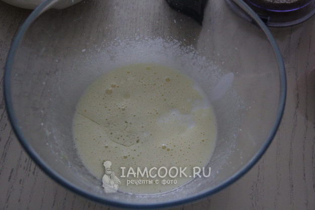 В глубокой миске соединить желтки, 45 г сахара, растительное масло и кефир. Перемешать венчиком.