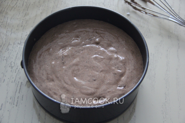 Тесто получится не густым, воздушным и гладким. Дно разъемной формы (18 см в диаметре) застелить пергаментом. Выложить тесто в форму. Выпекать корж в разогретой духовке при 180 градусах примерно 35-40 минут, до сухой зубочистки.