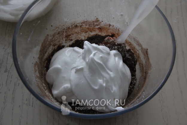 Затем добавить взбитые белки и аккуратно вмешать их в тесто.