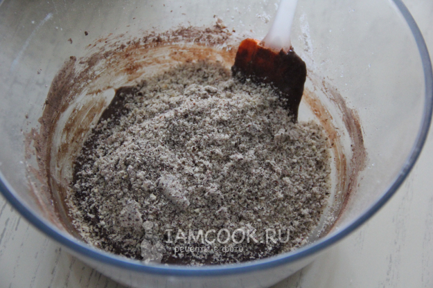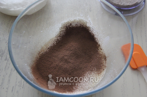 Всыпать просеянную муку, какао, разрыхлитель и соль.