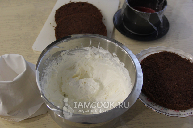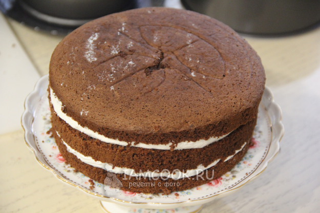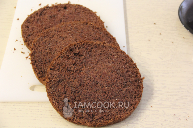 Разрезать бисквит на три коржа.