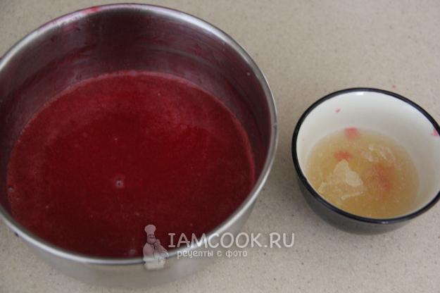 Перетереть горячую ягодную массу через сито, чтобы осталось только ягодное пюре. Выложить в горячее ягодное пюре набухший желатин и перемешать до полного растворения желатина.