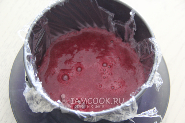 Форму диаметром 16 см выстелить пленкой и выложить в неё ягодную массу. Поставить желе в холодильник до полного застывания. Я поставила на ночь.