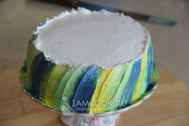 Затем остатками крема выровнять верх и бока торта. Немного крема отложить по мискам и окрасить любыми цветами. В хаотичном порядке выложить цветной крем по бокам торта.