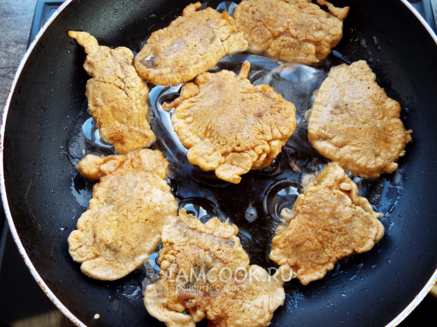 Жарить терпуга в кляре на сковороде по несколько минут на среднем огне.