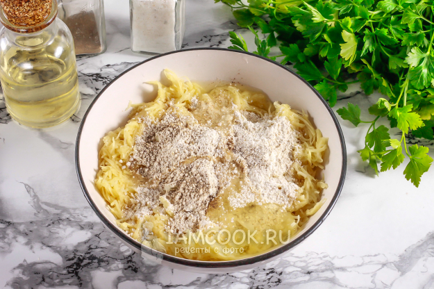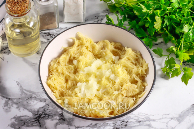 Картофельные клубни и лук очистите от кожуры и промойте в воде. Натрите на терке с мелкими ячейками в глубокую емкость. Посолите и поперчите, перемешайте и оставьте на 2-3 минуты. Дольше не нужно, так как масса может потемнеть. Отожмите выделившийся сок.