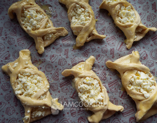 Справа налево перехлестнуть тесто, через отверстие, защипнуть по бокам.