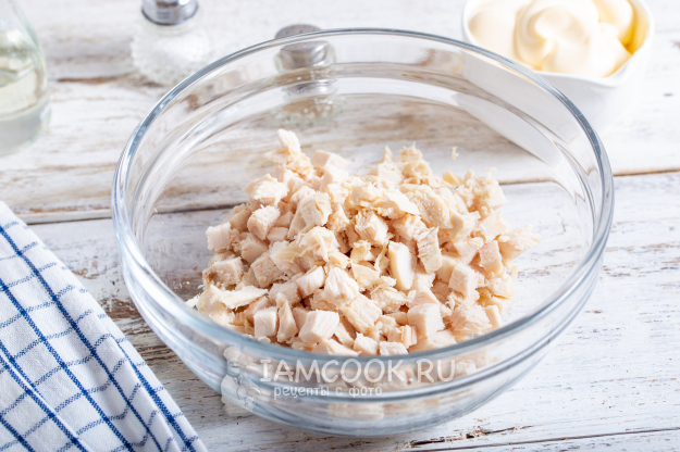Отварное куриное филе нарежьте кубиком и выложите в салатник.