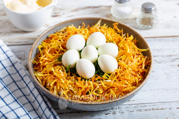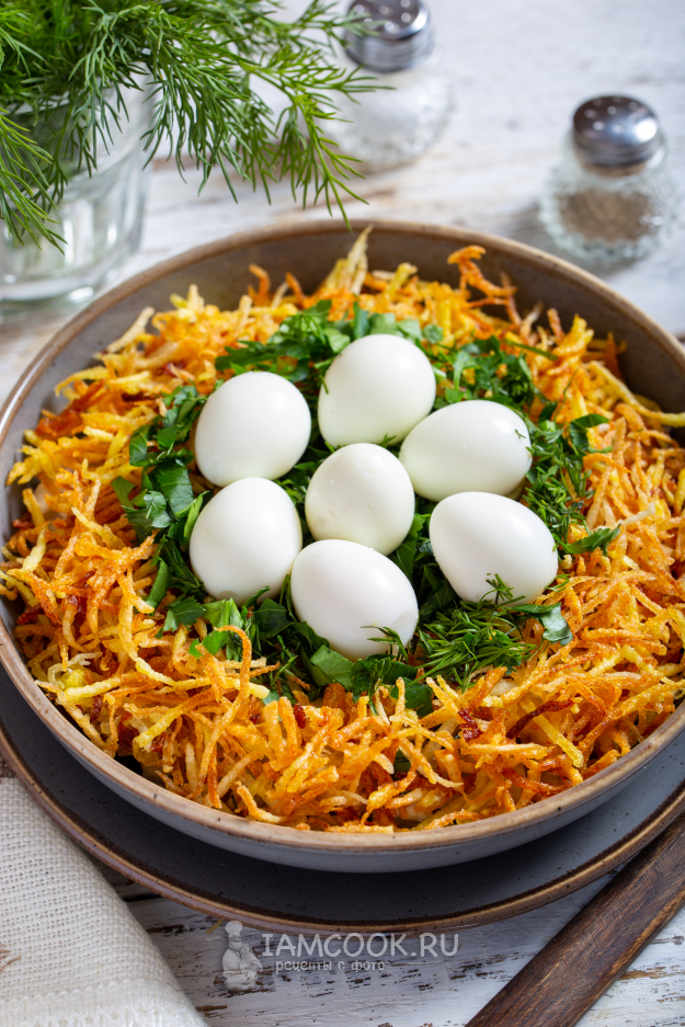 Салат «Гнездо аиста» готов к подаче на стол. Если застолье чуть позже, то салат можно оставить на столе, а вот накрывать его и убирать в холодильник не стоит - картофель перестанет быть хрустящим.
