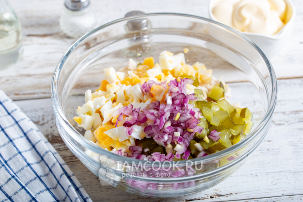 Лук для салата очистите и мелко порежьте, добавьте в салат. Салат пока уберите и приготовьте картофель пай для салата.