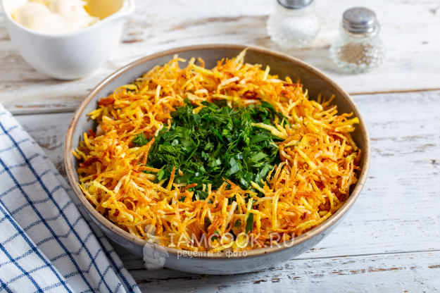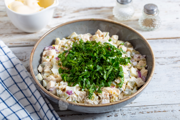 Свежую зелень помойте и встряхните от лишней жидкости. Мелко порежьте свежую зелень и выложите в середину салата.