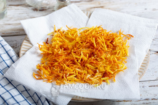 В разогретом растительном масле небольшими партиями обжарьте картофель до румяности. Готовый картофель выкладывайте на бумажные салфетки, чтобы убрать лишнее масло.
